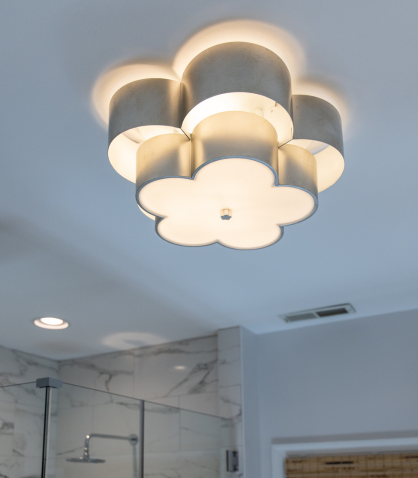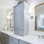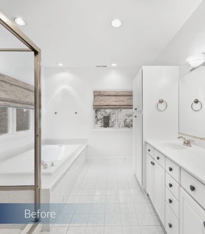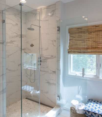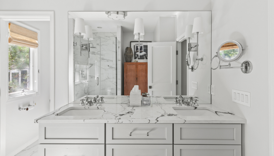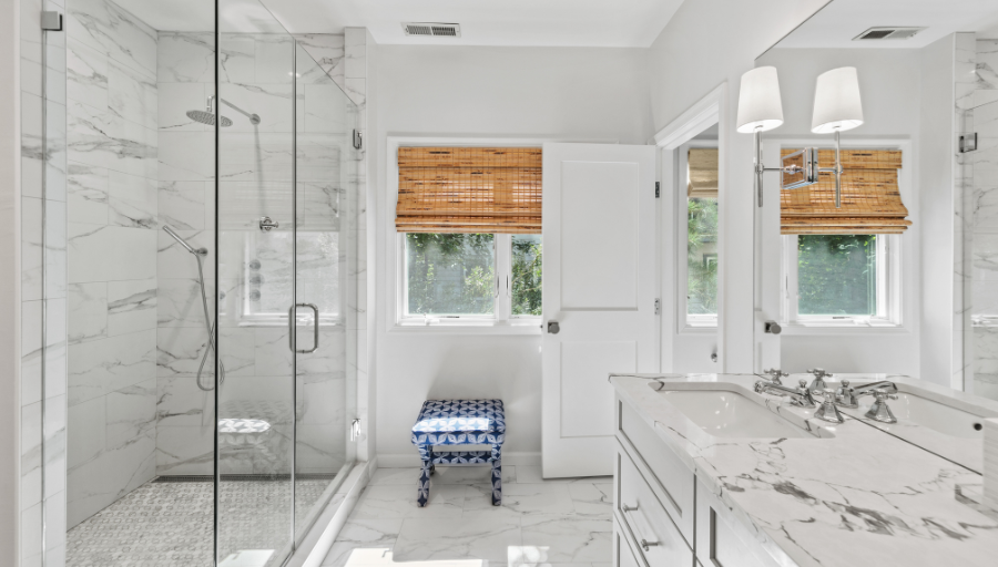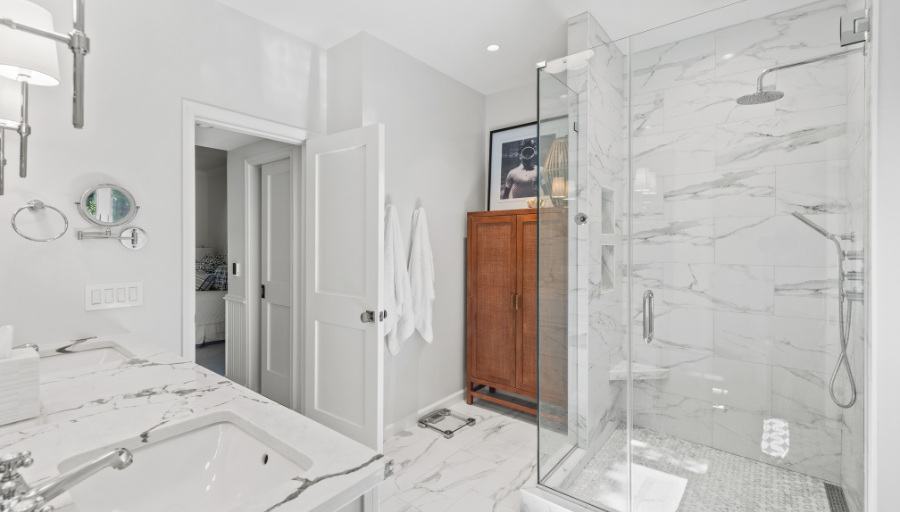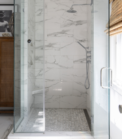 In the primary bathroom, we transformed the layout to maximize space and elevate the design. By removing the existing shower and tub, we made room for two spacious closets and a stunning walk-in shower. The new walk-in shower features Da Vinci Lux White tile on the walls from floor to ceiling and Carrara La Fleur tile on the floor, providing a serene, luxurious feel.