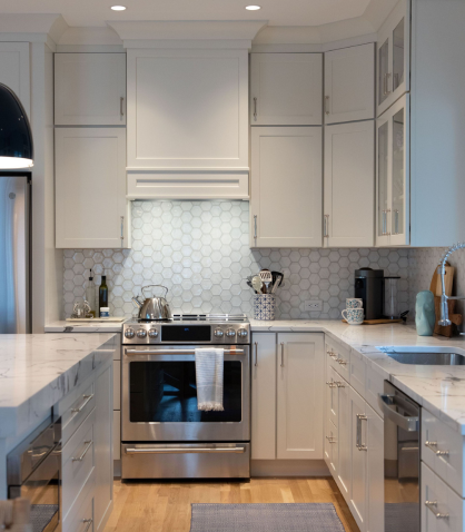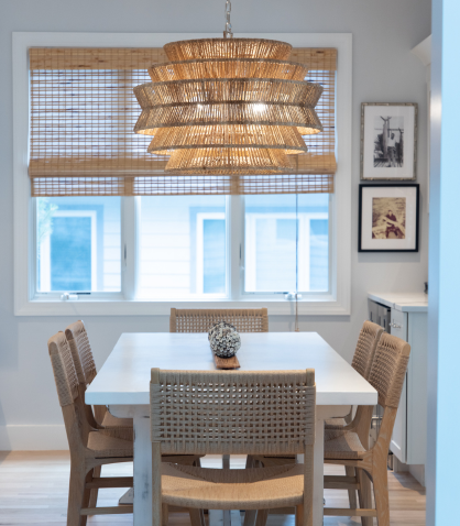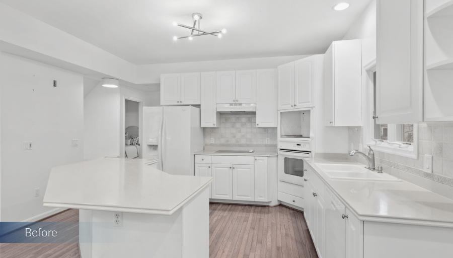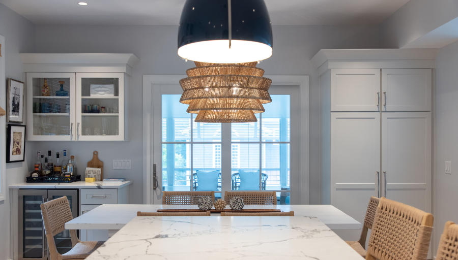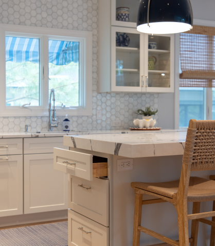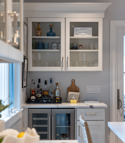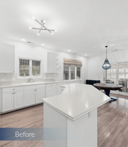 The kitchen’s new layout now serves as the heart of the home, with statement lighting and bright white features that are accented by pops of color. The addition of a wet bar, upgraded island layout, and new cabinetry made the space more usable and inviting. The refinished hardwood floors provide a fresh, elegant look, while the 3-inch Lustrado quartz countertop on the island adds a touch of luxury. This kitchen is now a perfect blend of style and practicality, ideal for entertaining guests throughout the summer and beyond.