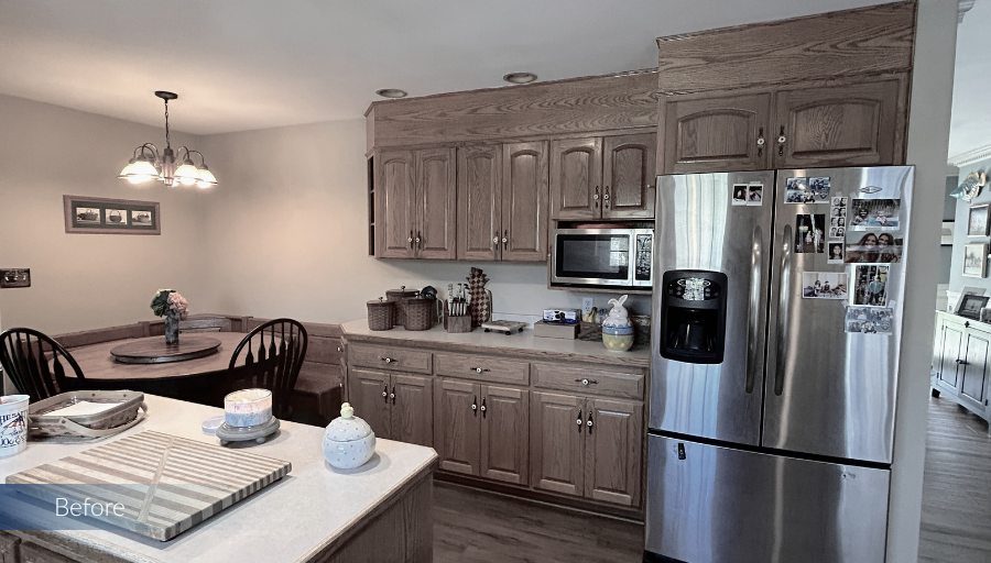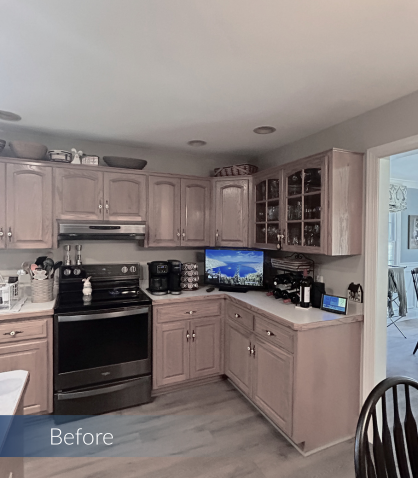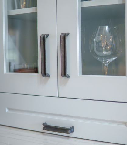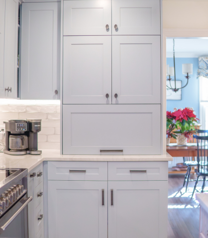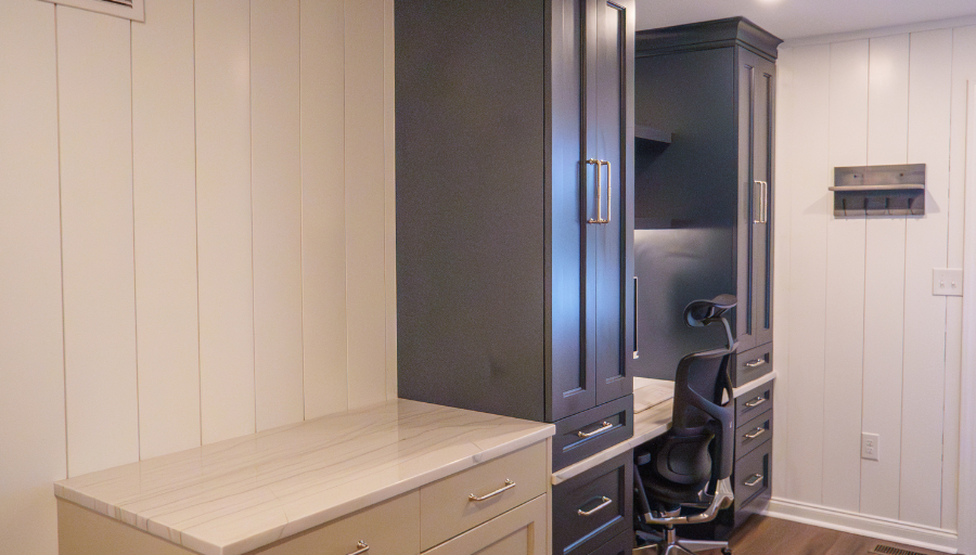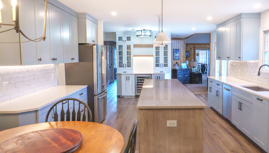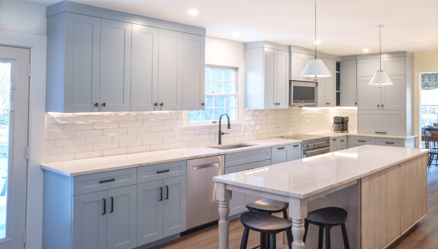 This Milton kitchen and office remodel was designed by our team to enhance both function and style. The island was expanded, the crisp white backsplash brightens the room, and the blue cabinetry adds a pop of color that enhances that coastal charm. The office completes the renovation with a space tailored for productivity and everyday living.