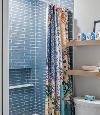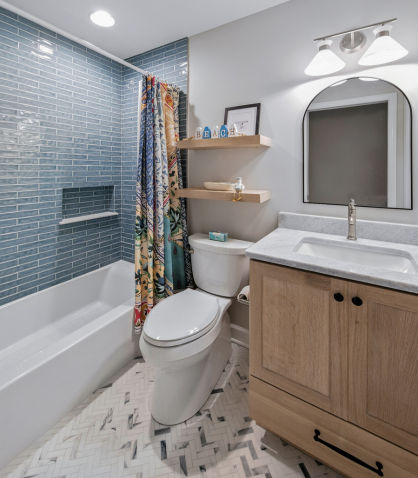 In the guest bathroom, a custom white oak vanity warms the space and provides a refined focal point. Light blue polished tile laid in a horizontal offset pattern wraps the shower walls, and a herringbone mosaic adds texture to the floor, turning this secondary space into a bright and welcoming retreat in its own right.