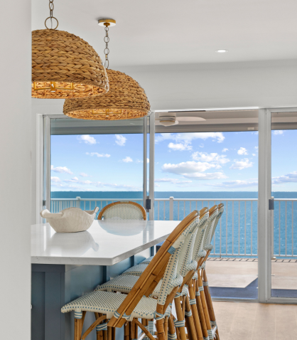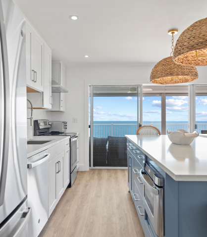 One of the standout features of this remodel is the kitchen, which has been relocated closer to the oceanfront balcony. This new layout not only enhances the natural light and stunning ocean views but also makes it ideal for entertaining.