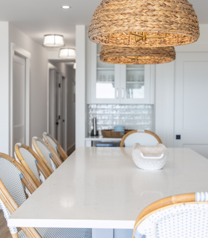 The kitchen, previously the dining room, now boasts a fresh coastal vibe. We replaced the outdated beige paneling and carpet with durable LVP flooring and installed new cabinetry. The Carrara White countertops provide a timeless elegance, while the 9-foot-long island, painted in a delightful “painted mist” blue, adds a vibrant pop of color and increases seating with its extended overhangs on both ends. Unique sea grass lighting fixtures from Visual Comfort complete the look, adding a touch of natural texture and coastal charm.