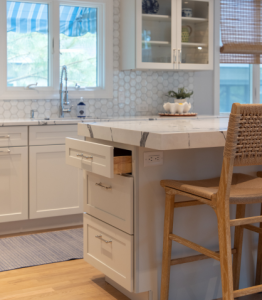 Cabinetry is one of the most used and noticeable elements in your home, especially in kitchens, bathrooms, and living spaces. Shaker-style doors in soft whites or warm taupes offer a classic coastal feel, while colors like blue add richness and contrast. But beauty only goes so far without smart storage: think pull-out shelves for pots and pans, hidden trash and recycling bins, vertical tray storage, soft-close drawers that never slam, and built-in drawer inserts to keep utensils or makeup organized. These thoughtful, tailored features make your home feel more custom, polished, and truly built around the way you live.